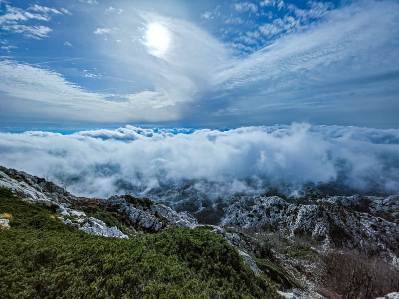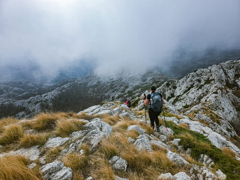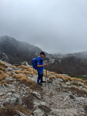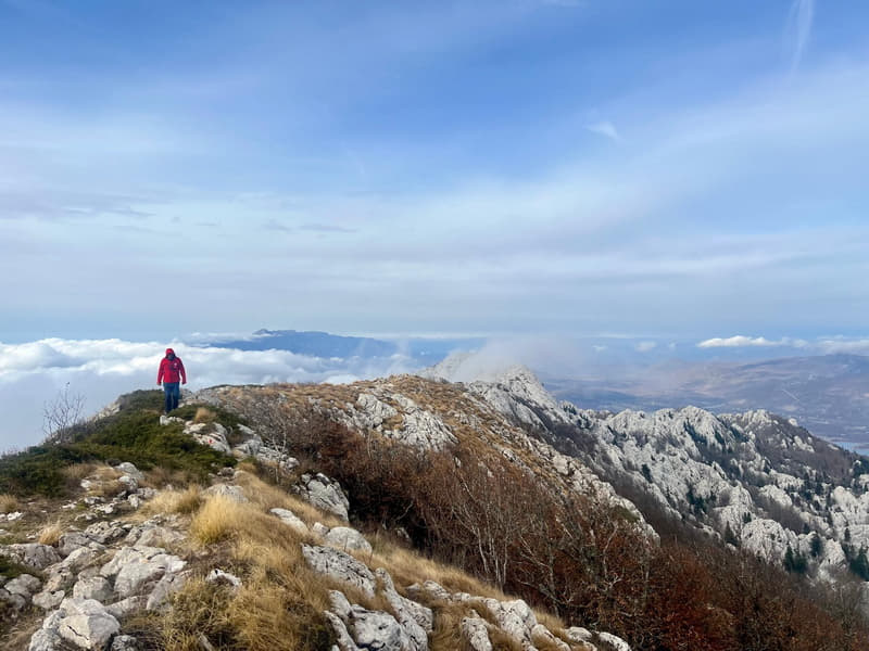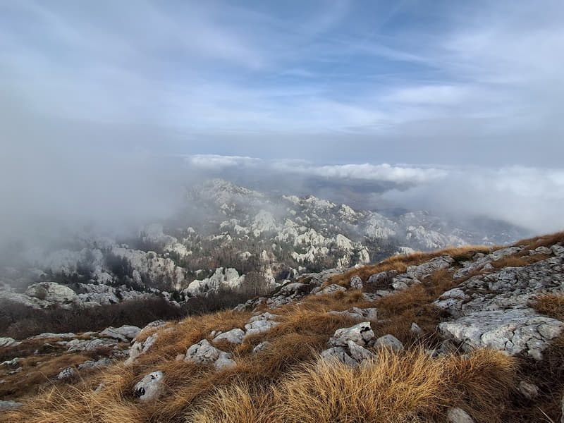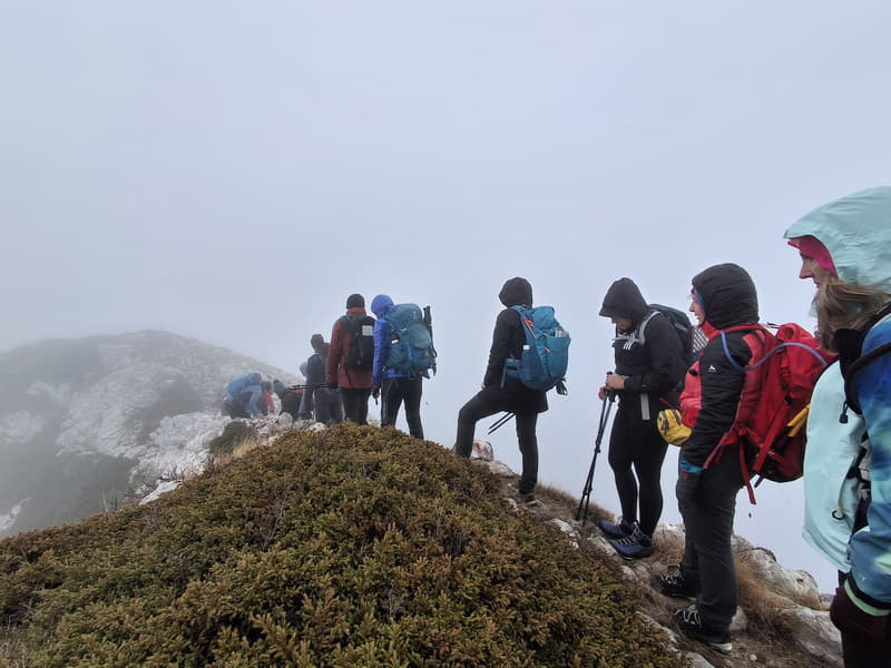 Pri dolasku na vrh ulazimo u svijet oblaka i magle, Ervin i ja ne skrivamo svoje oduševljenje vjetrom i maglom. Stvarno je bilo čarobno, a to se najbolje vidi, svi već znaju, na Igorovim fotkama. U zavjetrini radimo pauzu i uživamo u pogledu i tada Arijana, mlada vodička snaga Runolista, izgovori rečenicu koja mi se urezala u pamćenje i natjerala na razmišljanje: ‘’Kada je hladno, hladno mi je.’’ Hmm…
