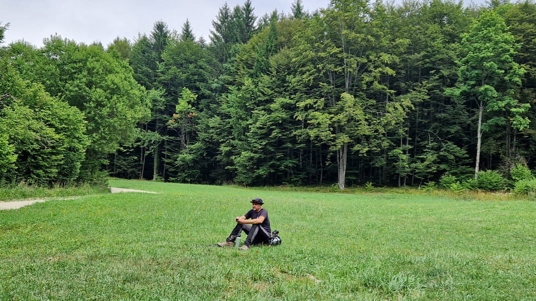 Kratak odmor na livadi i još petnaestak minuta hoda. U međuvremenu se i magla razišla pa se moglo uživati i u hrani i u pogledu i, konačno, u pivi!