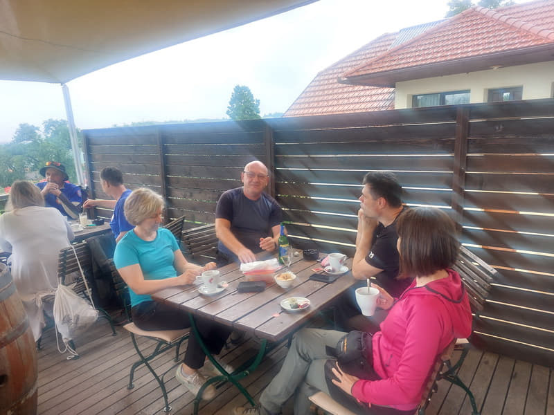 Krećemo, ali kreće i kiša! Prvo stajanje za jutarnju kavu na neimenovanoj benzinskoj. Pada prvi prijedlog o promjeni naziva izleta „Sedam benzinskih postaja”. Odbijeno! Pokret dalje prema Gabrju. Kiša sve jače pada. Nakon malo više od pola sata vožnje stižemo u Gabrje. Kiša ne prestaje. Novi prijedlog izleta „Staza sedam Slovenskih birtija”. To bi već moglo proći, ali i kiša prestaje pa je i on odbijen.