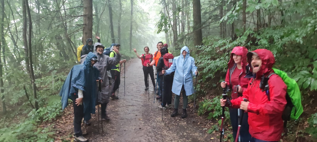 Spust prolazi u istom onom raspoloženju u kojem smo i počeli uspon. Šale, pošalice, zezanje, uglavnom veselo. U jednom se trenutku počelo smračivati, a rano popodne! Najava vesele pojave u obliku kiše. Petnaestak minuta prije dolaska na početnu točku počinje kišiti – „ma neće to jako”. Hehe, dobro je biti optimista!! Spustio se pljusak koji je od svakog od nas napravio slap s početka ove priče. I tako, hoda 16 slapova, neki dječje sretni ovim pljuskom, drugi malo manje sretni, ali i dalje dobre volje.