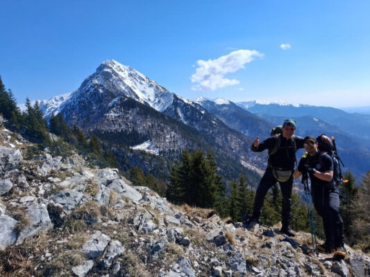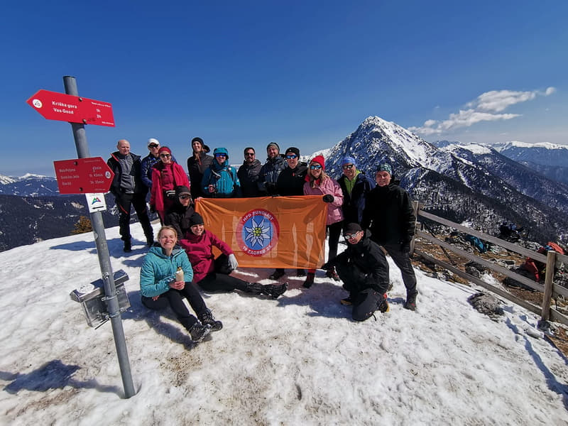 Nakon Tolstog vrha usput do Koče na Kriški gori popeli smo se nekoliko metara do vrha Vrata. Tamo je staza bila prilično blatnjava pa je bilo i žrtava ovog dodatnog izazova u obliku prljave odjeće od neplaniranog sjedenja u blatnoj kaljuži. Dolaskom do Koče za nagradu smo dobili potpuno mirno vrijeme uz obilje sunca pa smo unatoč punim ruksacima odjeće spremljenom za sve uvjete – kišu, vjetar, snijeg, led i debele minuse, ispred Koče mogli sjediti u majicama kratkih rukava i uživati u odličnoj klopi uz pripadajuću cugu.